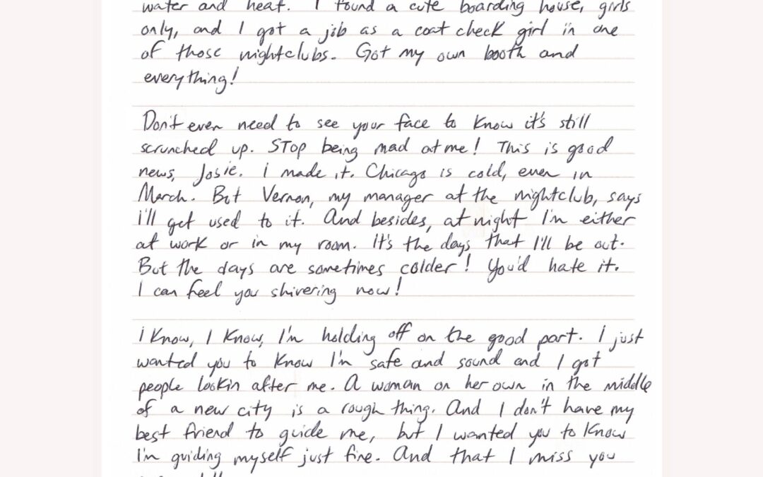 Don’t even need to see your face to know it’s still scrunched up. Stop being mad at me! This is good news, Josie. I made it. Chicago is cold, even in March. But Vernon, my manager at the nightclub, says I’ll get used to it. And besides, at night I’m either at work or in my room. It’s the days that I’ll be out. But the days are sometimes colder! You’d hate it. I can feel you shivering now!