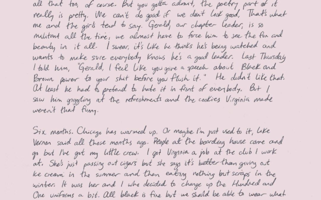Page 1: Dear Josie, Greetings from your Hundred and One sister. Let’s be the one today to make the change! That’s our rallying cry. Ain’t it fun! I mean, serious and important and all that too, of course. But you gotta admit, the poetry part of it is really pretty. We can’t do good if we don’t look good. That’s what me and the girls tend to say. Gerald, our chapter leader, is so militant all the time, we almost have to force him to see the fun and the beauty in it all. I swear, it’s like he thinks he’s being watched and wants to make sure everybody knows he’s a good leader. Last Thursday I told him, “Gerald, I feel like you give a speech about Black and Brown power to your shit before you flush it.” He didn’t like that. At least he had to pretend to hate it in front of everybody. But I saw him giggling at the refreshments and the cookies Virginia made weren’t that funny. Six months. Chicago has warmed up. Or maybe I’m just used to it, like Vernon said all those months ago. People at the boarding house come and go but I’ve got my little crew. I got Virginia a job at the club I work at. She’s just passing out cigars but she says it’s better than giving out ice cream in the summer and then eating nothing but scraps in the winter. It was her and I who decided to change up the Hundred and One uniforms a bit. All black is fine but we should be able to wear whatever kinda clothes we want, as long as you have your pins and buttons in some recognizable place. We kept the berets though, mostly because they were cute. The more I help, the more I want to do more. I think this might truly be one of those “callings” pastors are always talking about. Gerald and other leaders can see it too I think. They don’t praise me necessarily,