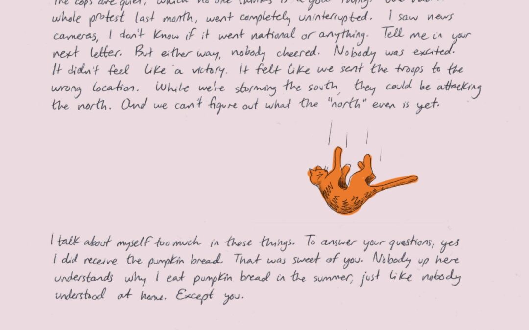 Page 3: They gave us pins when we started. And a few folks have stopped wearing them when they’re not doing Hundred duty. That’s not me. It could be safer but we shouldn’t be hiding ourselves. We not the KKK. We’re not killing anybody. We’re trying to stay alive. But with half the city thinking Fred Hampton is a devilman and the other half thinking he’s Jesus’ brother, people are scared. The cops are quiet, which no one thinks is a good thing. We had a whole protest last month, went completely uninterrupted. I saw news cameras, I don’t know if it went national or anything. Tell me in your next letter. But either way, nobody cheered. Nobody was excited. It didn’t feel like a victory. It felt like we sent the troops to the wrong location. While we’re storming the south, they could be attacking the north. And we can’t figure out what the “north” even is yet. I talk about myself too much in these things. To answer your questions, yes I did receive the pumpkin bread. That was sweet of you. Nobody up here understands why I eat pumpkin bread in the summer, just like nobody understood at home. Except you. And no, I still don’t know where Donny Hathaway’s house is. And I don’t wanna find out. That’s creepy, Josie. And finally, yes I never put as much sugar in nana’s tea as she wants. Use my trick and tell her to go get my special glass from the cupboard while you make it. If she had it her way she’d have a little bit of tea with her sugar. That woman is a trip.