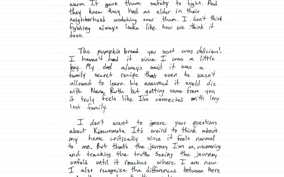 Dear Tashina, Getting to know you these past few weeks has been amazing, thank you again. It seems like Josephine became an activist in her own right. I think you’re right, she might not have felt like a leader at the time, but the clothes she sewed kept people warm. It gave them safety to fight. And they knew they had an elder in their neighborhood watching over them. I don’t think fighting always looks like how we think it does. The pumpkin bread you sent was delicious! I haven’t had it since I was a little boy. My dad always said it was a family secret recipe that even he wasn’t allowed to learn. We assumed it would die with Nana Ruth but getting some from you, it truly feels like I’ve connected with long lost family. I don’t want to ignore your questions about Kimunmoto. It’s weird to think about my home critically since it feels normal to me. But that’s the journey I’m on, uncovering and tracking the truth. Seeing the journey unfold until it reaches where I am now. I also recognize the differences between here and the rest of the nation. My grandmother, after becoming the leader of the Hundred and One group, used her strength and power to form this place. It isn’t a paradise by any means. There’s no Eden to be found where human nature lives. But it feels free. And from reading the letters from back in the sixties and seventies, both sent and
