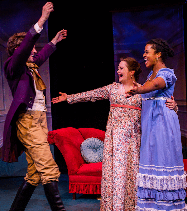 Three actors in Regency-era dress reach out their arms for a group hug.