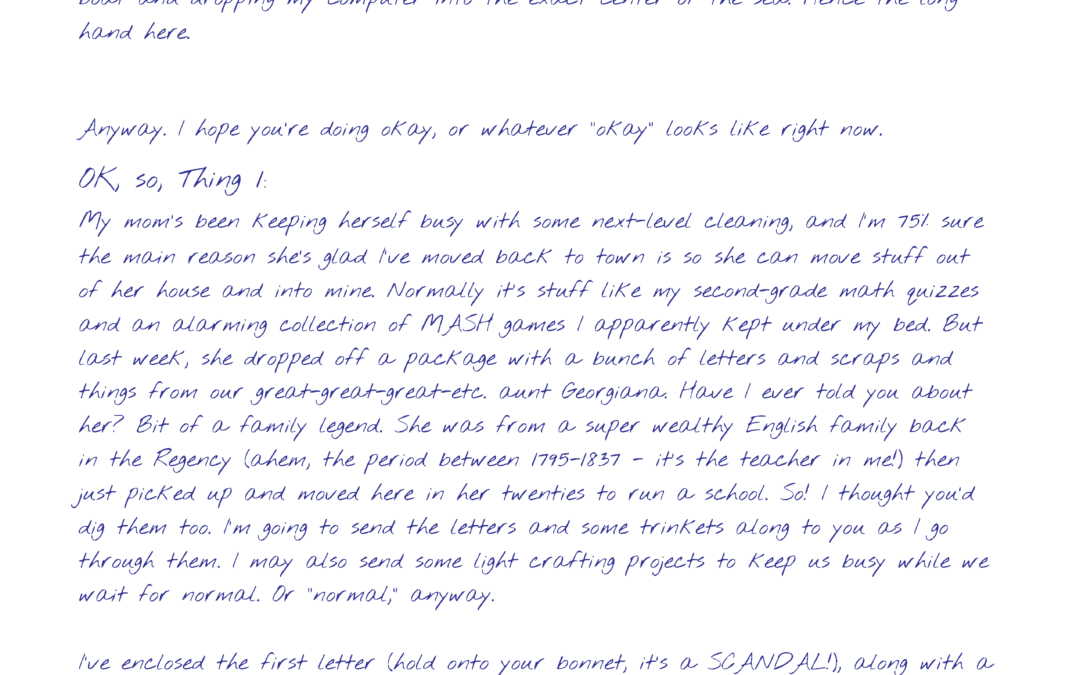 Page 1: April 29, 2021 Hey friend! Listen. I’ve been remote teaching and remote happy houring and remote board gaming then this week I ALSO had remote book club, and I cannot look at another screen for one more minute. Can’t, won’t, shan’t. Contemplating renting a boat and dropping my computer into the exact center of the sea. Hence the longhand here. Anyway. I hope you’re doing okay, or whatever “okay” looks like right now. OK, so, Thing 1: My mom’s been keeping herself busy with some next-level cleaning, and I’m 75% sure the main reason she’s glad I’ve moved back to town is so she can move stuff out of her house and into mine. Normally it’s stuff like my second-grade math quizzes and an alarming collection of MASH games I apparently kept under my bed. But last week, she dropped off a package with a bunch of letters and scraps and things from our great-great-great-etc. aunt Georgiana. Have I ever told you about her? Bit of a family legend. She was from a super wealthy English family back in the Regency (ahem, the period between 1795-1837 – it’s the teacher in me!) then just picked up and moved here in her twenties to run a school. So! I thought you’d dig them too. I’m going to send the letters and some trinkets along to you as I go through them. I may also send some light crafting projects to keep us busy while we wait for normal. Or “normal,” anyway. I’ve enclosed the first letter (hold onto your bonnet, it’s a SCANDAL!), along with a little painting-slash-research project I did on my own after reading it. I hope this is fun for you! It is for me, so…sorry not sorry for roping you into it! Thing 2: I kept hoping we’d be able to keep our re-re-re-rescheduled 7th Annual Best-Teas Party on the books, but that’s not looking likely. Rather than rescheduling for the