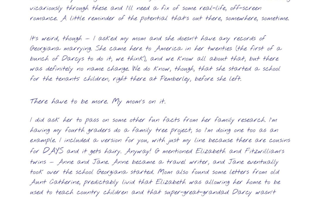 Page 1: March 16, 2022 Hey friend! I told you we had a love story on our hands! Henry Stanhope seems to have done a real number on our girl here! The bad news, though? This is the last one in the bundle my mom gave me. There HAVE to be more. There have to be! I’m living vicariously through these and I’ll need a fix of some real-life, off-screen romance. A little reminder of the potential that’s out there, somewhere, sometime. It’s weird, though — I asked my mom and she doesn’t have any records of Georgiana marrying. She came here to America in her twenties (the first of a bunch of Darcys to do it, we think), and we know all about that, but there was definitely no name change. We do know, though, that she started a school for the tenants’ children, right there at Pemberley, before she left. There have to be more. My mom’s on it. I did ask her to pass on some other fun facts from her family research. I’m having my fourth graders do a family tree project, so I’m doing one too as an example. I included a version for you, with just my line because there are cousins for DAYS and it gets hairy. Anyway! G mentioned Elizabeth and Fitzwilliam’s twins — Anne and Jane. Anne became a travel writer, and Jane eventually took over the school Georgiana started. Mom also found some letters from old Aunt Catherine, predictably livid that Elizabeth was allowing her home to be used to teach country children and that super-great-grandad Darcy wasn’t stopping her, but it doesn’t seem like anyone paid her much mind. Jane (sister Jane, that is, not twin Jane) and Charles lived happily and quietly and raised a brood of kids. Mary started an etiquette column under the name Miss Morals ; the Derbyshire cousins have a couple of cuttings and they report that the thesis seems generally to be “Have no fun, whatsoever, at any time, for any reason.” Kitty stays pretty quiet; not sure what happened there. Lizzy and Fitzwilliam eventually had a son too: Gardiner, aka my great-great-etc. grandpa!