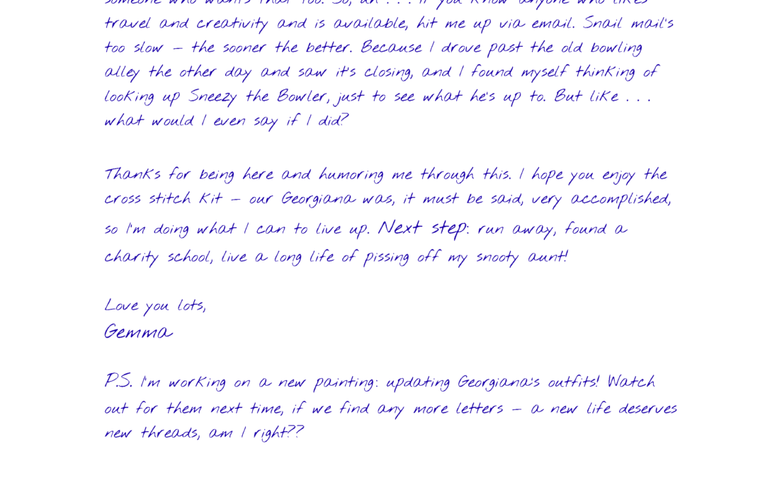 Page 2: I’m glad Aunt G made the choices that made her happy. The idea of having good, useful work that lets you also set off for the horizon with someone you love by your side? It’s the dream. I want someone to show me desert flowers, snowy peaks, the sea – I want to breathe new air with someone who wants that too. So, uh . . . if you know anyone who likes travel and creativity and is available, hit me up via email. Snail mail’s too slow — the sooner the better. Because I drove past the old bowling alley the other day and saw it’s closing, and I found myself thinking of looking up Sneezy the Bowler, just to see what he’s up to. But like . . . what would I even say if I did? Thanks for being here and humoring me through this. I hope you enjoy the cross stitch kit — our Georgiana was, it must be said, very accomplished, so I’m doing what I can to live up. Next step: run away, found a charity school, live a long life of pissing off my snooty aunt! Love you lots, Gemma P.S. I’m working on a new painting : updating Georgiana’s outfits! Watch out for them next time, if we find any more letters — a new life deserves new threads, am I right??