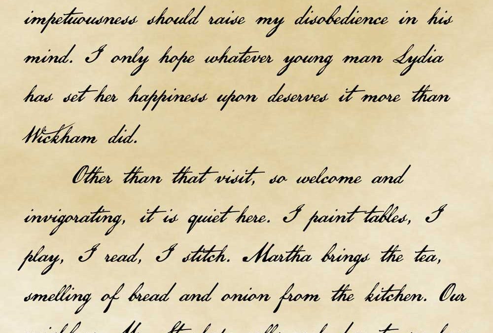Page 5: found herself in some trouble not unlike the kind I sought last year. I heard my brother mutter “Damned Wickham!” before riding off in a huff. I grieve that my actions of the last year should weigh on him still, such that another young lady’s impetuousness should raise my disobedience in his mind. I only hope whatever young man Lydia has set her happiness upon deserves it more than Wickham did. Other than that visit, so welcome and invigorating, it is quiet here. I paint tables, I play, I read, I stitch. Martha brings the tea, smelling of bread and onion from the kitchen. Our neighbour Mr. Stanhope calls each day to see how I am faring. It is strange — he brings the scent of Christmas, or of the oranges of Spain, but is perfectly at home in our English parlour in August. He brings me wildflowers that he picks along the