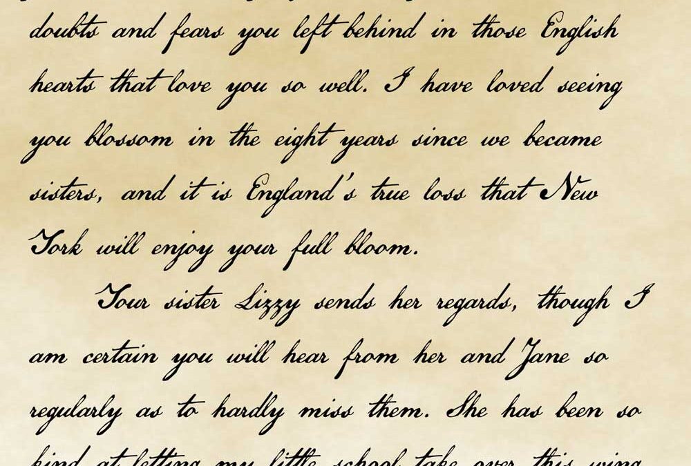 3 October, 1820 My dear Kitty, How wonderful to hear such cheering tidings of your first weeks in this new life! America and your husband clearly agree with you, no matter the doubts and fears you left behind in those English hearts that love you so well. I have loved seeing you blossom in the eight years since we became sisters, and it is England’s true loss that New York will enjoy your full bloom. Your sister Lizzy sends her regards, though I am certain you will hear from her and Jane so regularly as to hardly miss them. She has been so kind at letting my little school take over this wing of the house, and she even takes the children on expeditions in rain and sun alike to fill their lungs with fresher air than even the grandest Pemberley room can offer. I must confess that I have never