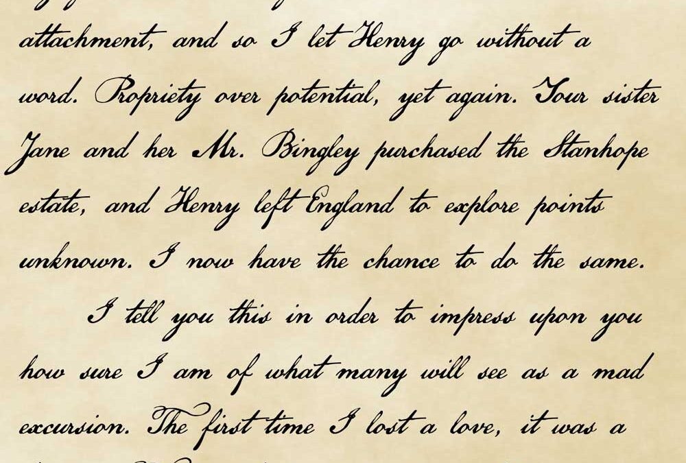Page 4: But I do not hate him for his choice: Soon after, the Stanhope patriarch’s gambling lost both the family home and the family name. I doubt that the girl I was then could have borne putting my good brother through a second scandalous attachment, and so I let Henry go without a word. Propriety over potential, yet again. Your sister Jane and her Mr. Bingley purchased the Stanhope estate, and Henry left England to explore points unknown. I now have the chance to do the same. I tell you this in order to impress upon you how sure I am of what many will see as a mad excursion. The first time I lost a love, it was a blessing. The second time, though painful, was as well, for I see now that my life was meant for something other than what a marriage could offer me. This third opportunity to follow my heart shall not hit amiss. I have been happy, with good work