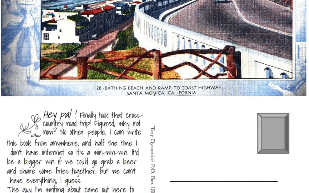 Postcard text: Hey pal ! Finally took that cross- country road trip! Figured, why not now? No other people, I can write this book from anywhere, and half the time I don’t have internet so it’s a win-win-win. It’d be a bigger win if we could go grab a beer and share some fries together, but we can’t have everything, I guess. The guy I’m writing about came out here to explore way back when. Figured I’d take a walk in his very old shoes, though I imagine the terrain has changed since the 19th century. Saw some outrageous wildflowers, though; maybe he did too. I’ll write again at my next destination. A bit scary but mostly fun to not be sure where it is! -Hank