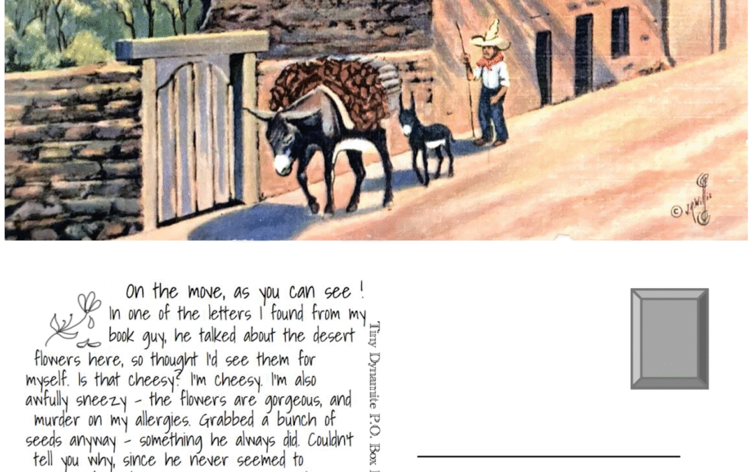 Postcard text: On the move, as you can see ! In one of the letters I found from my book guy, he talked about the desert flowers here, so thought I’d see them for myself. Is that cheesy? I’m cheesy. I’m also awfully sneezy – the flowers are gorgeous, and murder on my allergies. Grabbed a bunch of seeds anyway – something he always did. Couldn’t tell you why, since he never seemed to get around to planting them. Something about potential, I think.? I’ve been thinking a lot about that – potential. The potential of this book, this trip, what comes after all this. Wasted potential, too – I asked my first crush out with a note, but I panicked and stole it back before she could answer. Wouldn’t do that now, after everything. Not sure where’s next – I’ll write when I get there though! To potential – Hank