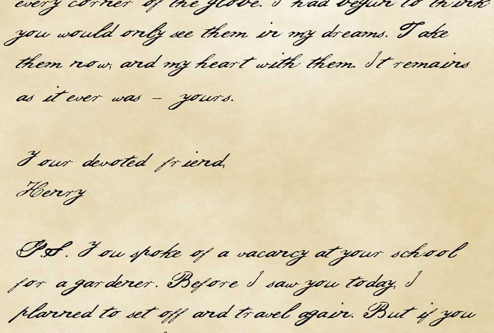 If you will permit me a visit, however, I will bring you a gift. I cannot bring you wildflowers as in our younger days, but I have collected seeds from everywhere I have been. They were always for you, in the hope that I might someday be able to grow you wildflowers from every corner of the globe. I had begun to think you would only see them in my dreams. Take them now, and my heart with them. It remains as it ever was — yours. Your devoted friend, Henry P.S. You spoke of a vacancy at your school for a gardener. Before I saw you today, I planned to set off and travel again. But if you will have me, I will gladly root to this spot and tend a garden for you for as long as you wish it. The choice is yours, and always will be.