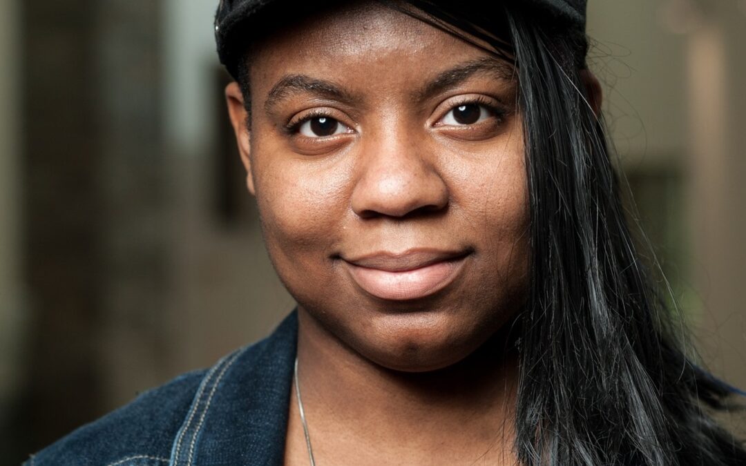 A woman with brown skin and black hair wears a black baseball cap and denim shirt and smiles at the camera.
